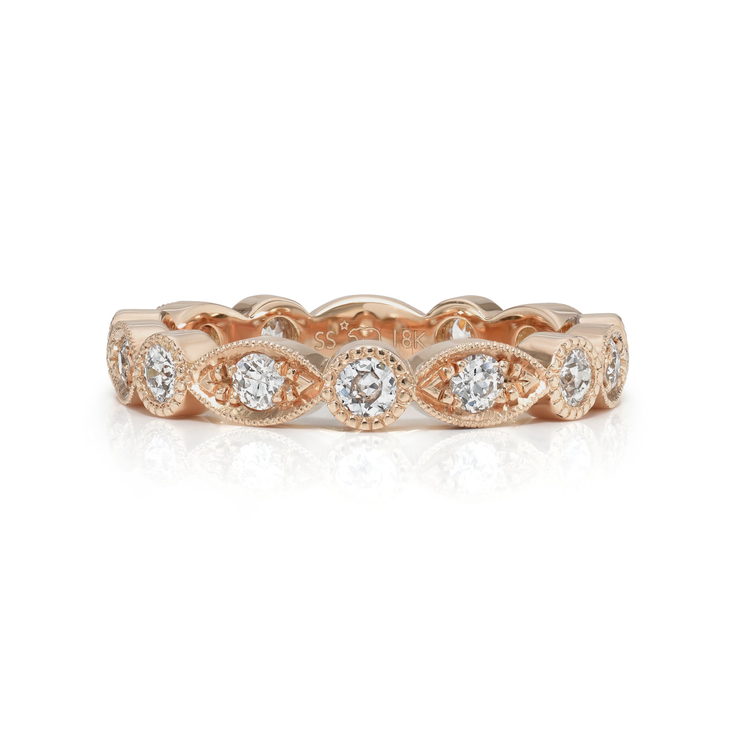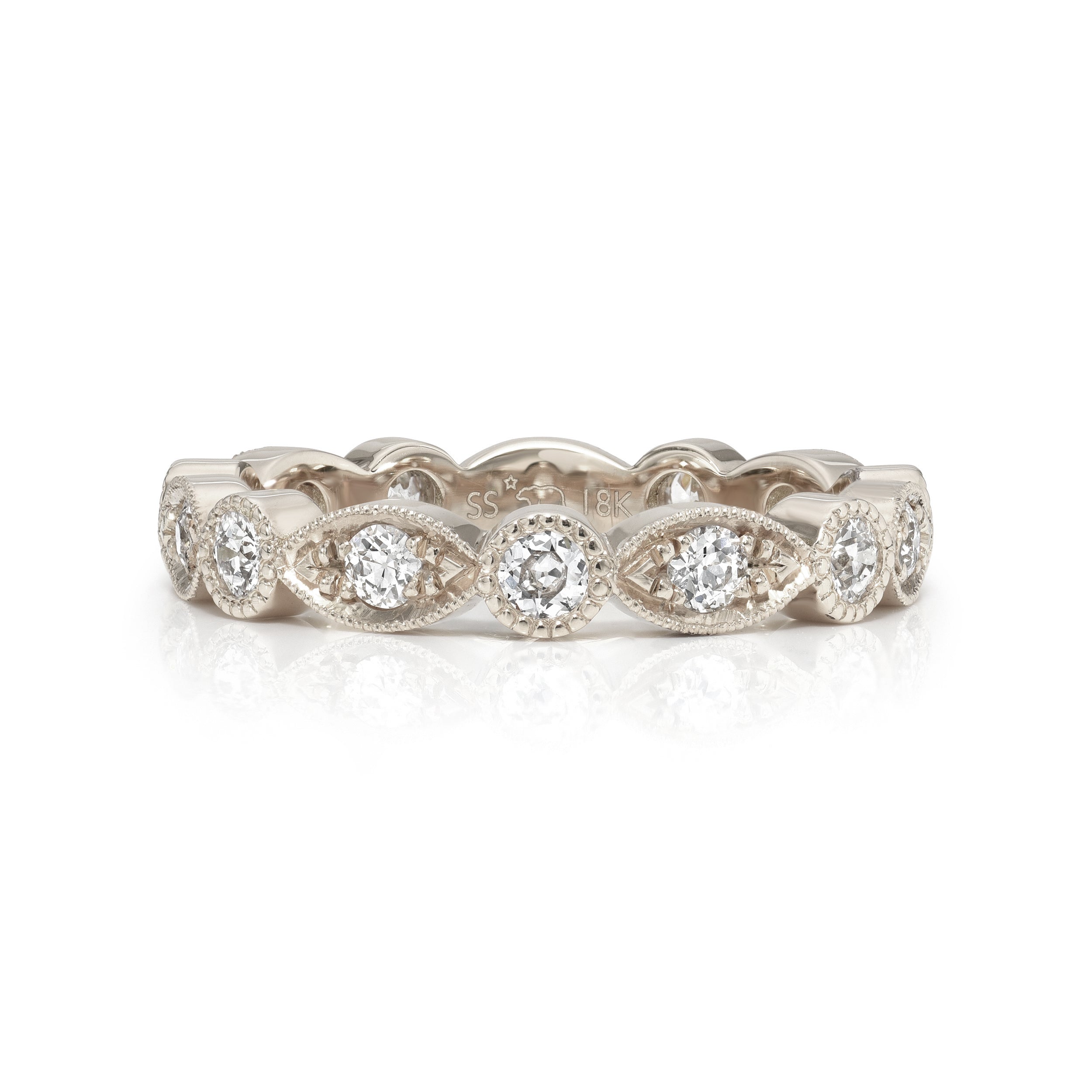 The 19th century brought about techniques that advanced the diamond cutting industry and thus, the old European cut diamond was born. With 58 facets, a small table, high crown angle, circular shape, and open culet, the old European cut diamond became the precursor to the modern round diamonds that we see today. Our vintage old European cut diamonds, cut primarily in the 1920s and 1930s, are used in many of our designs, from larger center stones to small, pave set diamonds.
