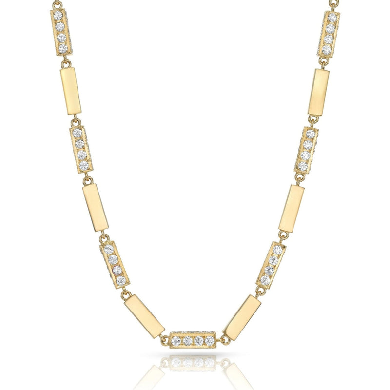 9.87ctw G-H/VS old European cut diamonds pavé set in a handcrafted 18K yellow gold alternating diamond and full bar necklace.
