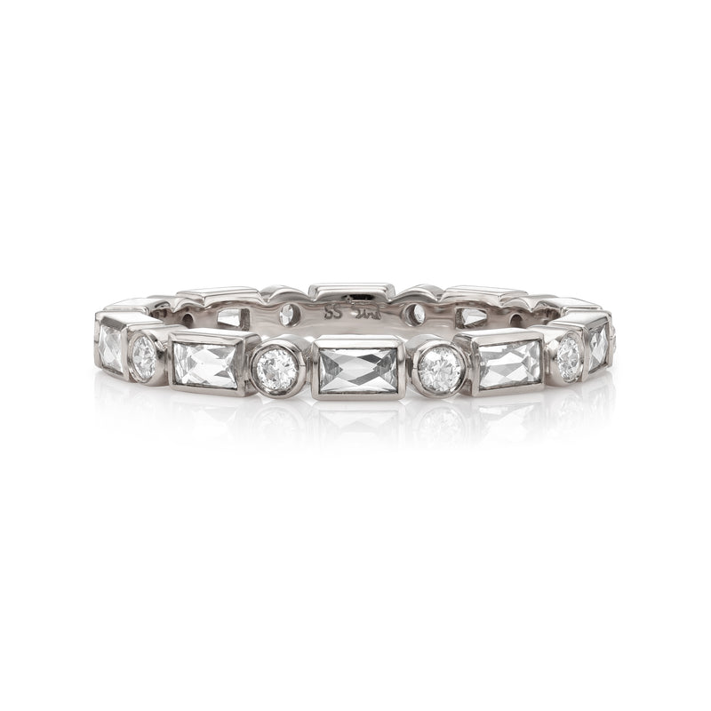 Approximately 1.00ctw G-H/VS old European and French cut diamonds bezel set in a handcrafted eternity band.