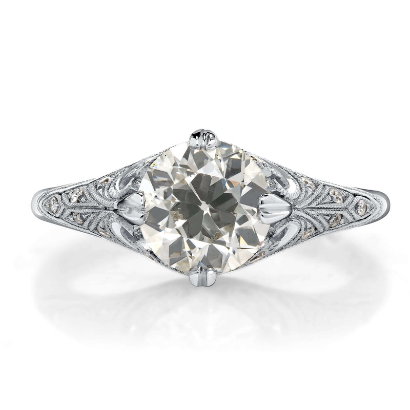 The 19th century brought about techniques that advanced the diamond cutting industry and thus, the old European cut diamond was born. With 58 facets, a small table, high crown angle, circular shape, and open culet, the old European cut diamond became the precursor to the modern round diamonds that we see today. Our vintage old European cut diamonds, cut primarily in the 1920s and 1930s, are used in many of our designs, from larger center stones to small, pave set diamonds.