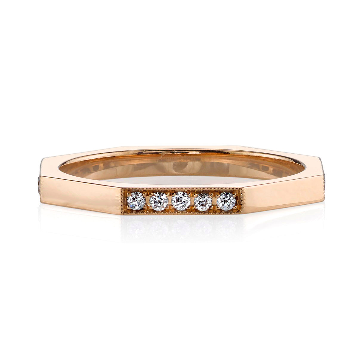 Approximately 0.20ctw old European cut diamonds pavé set in a handcrafted sectional octagonal band.