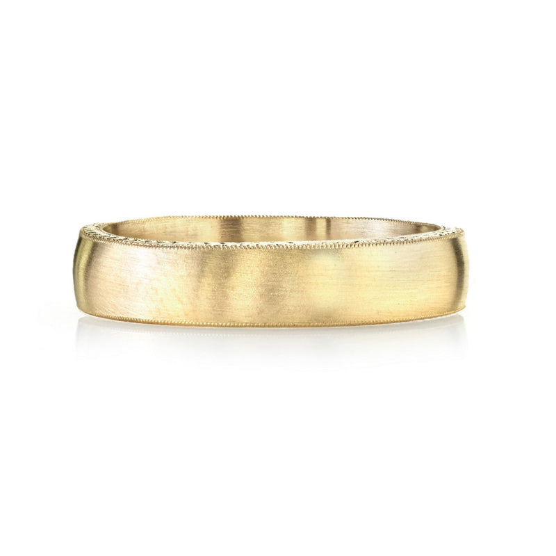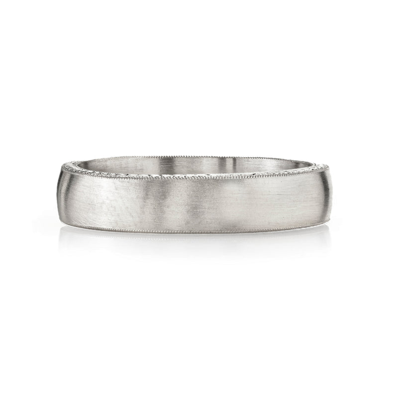 5mm handcrafted satin finished Men's band with engraved sidewalls.