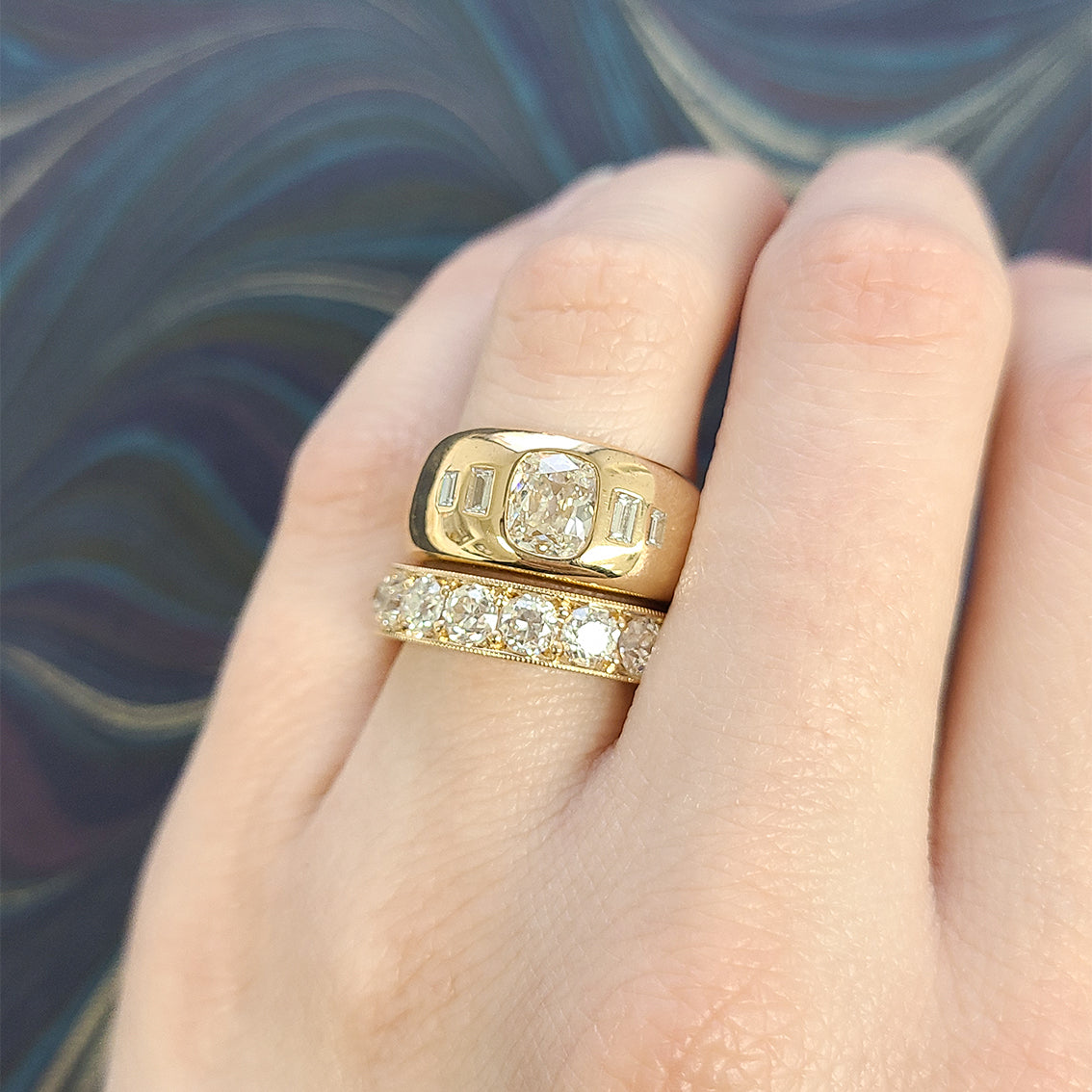 If the 4 Cs of Diamond Quality are Cut, Color, Clarity, and Carat Weight, then antique diamonds offer a 5th C: Character. With a unique play of light due to their hand-cut nature, each antique diamond is truly one-of-a-kind. The appeal of these rare diamonds lies in their broad facet patterns, their unique silhouettes, and their ability to dazzle in low and modern lighting conditions. Unlike their modern counterparts, which are cut with modern machinery and to exacting specifications, there are only a finite number of antique diamonds available, making them scarce and highly sought after. Repurposing antique diamonds also reduces environmental impact, which is something we feel very strongly about.
