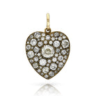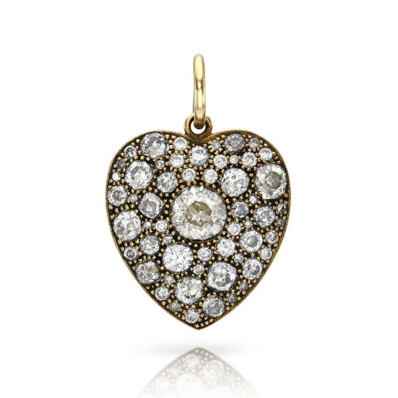 1.46ct O-P/I1 GIA certified old European cut diamond surrounded by 3.89ctw varying old cut and round brilliant cut diamonds set in a handcrafted, oxidized 18K yellow gold heart-shaped pendant.