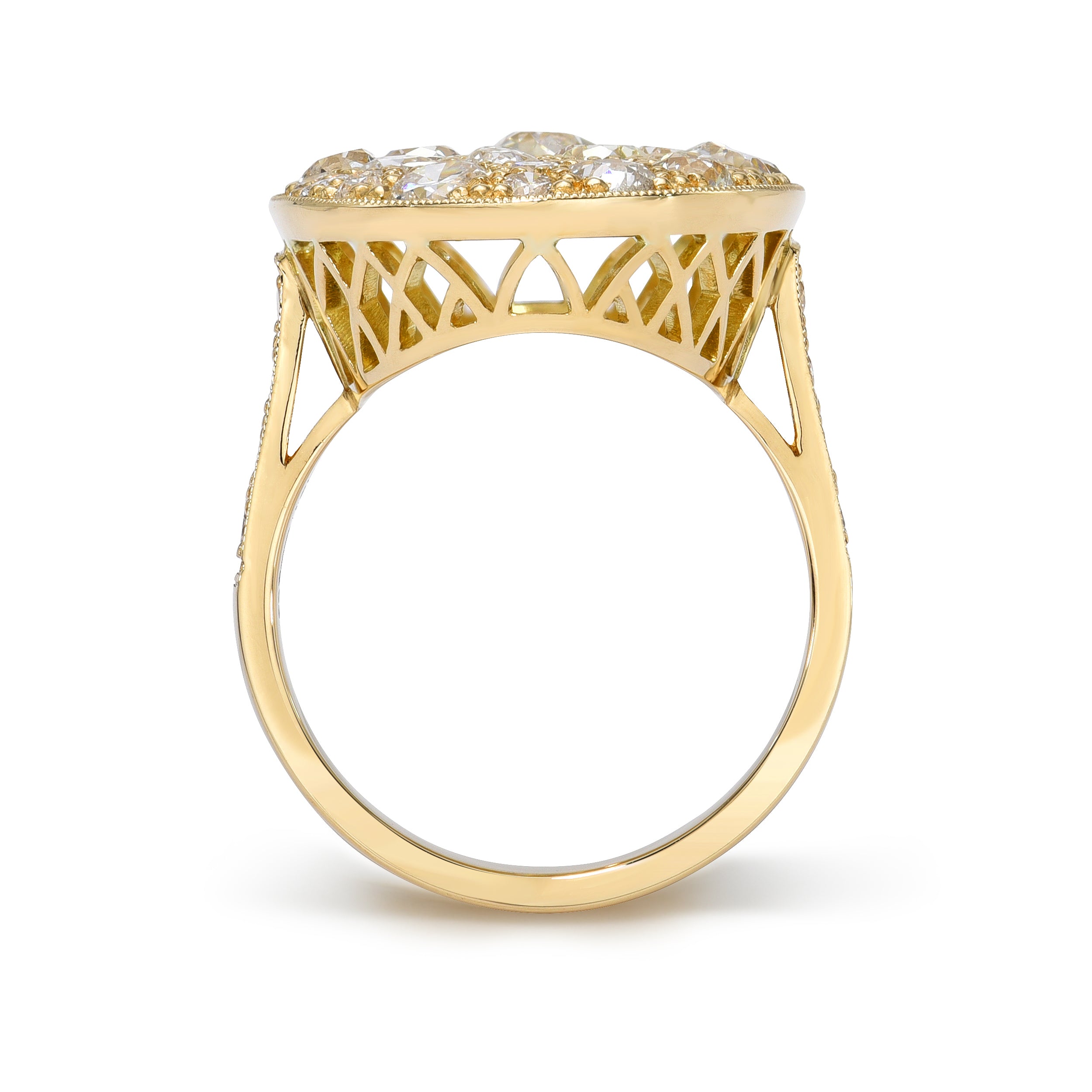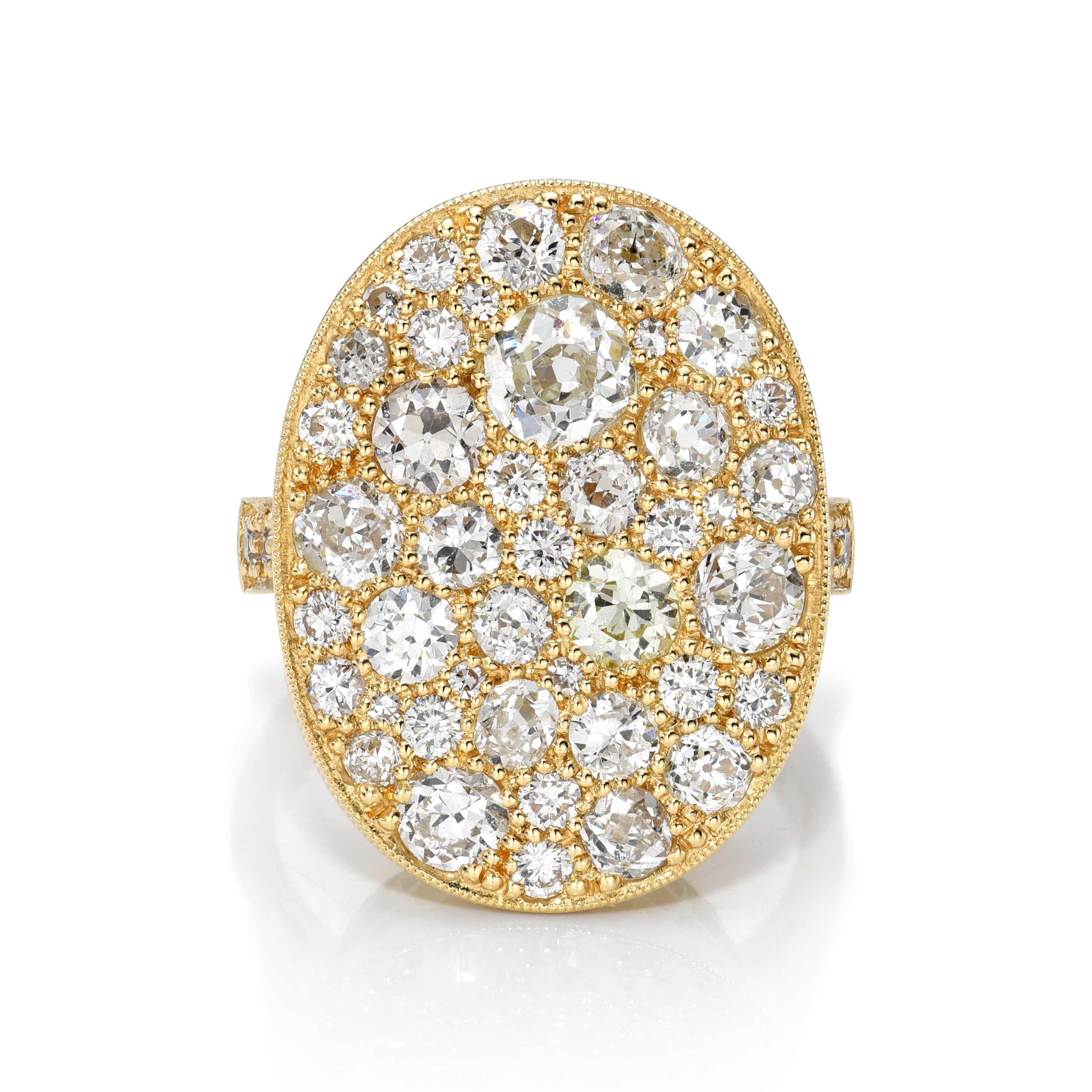 Approximately 3.00-3.75ctw various old cut and round brilliant cut diamonds set in a handcrafted oxidized 18K yellow gold mounting. Price may vary according to total diamond weight. Available in polished or oxidized finishes. Measurements 22.5mm x 17mm.