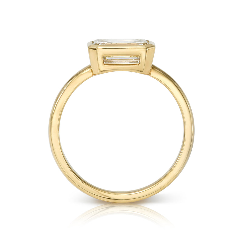 1.58ct J/VVS2 GIA certified emerald cut diamond bezel set in a handcrafted 18K yellow gold mounting.