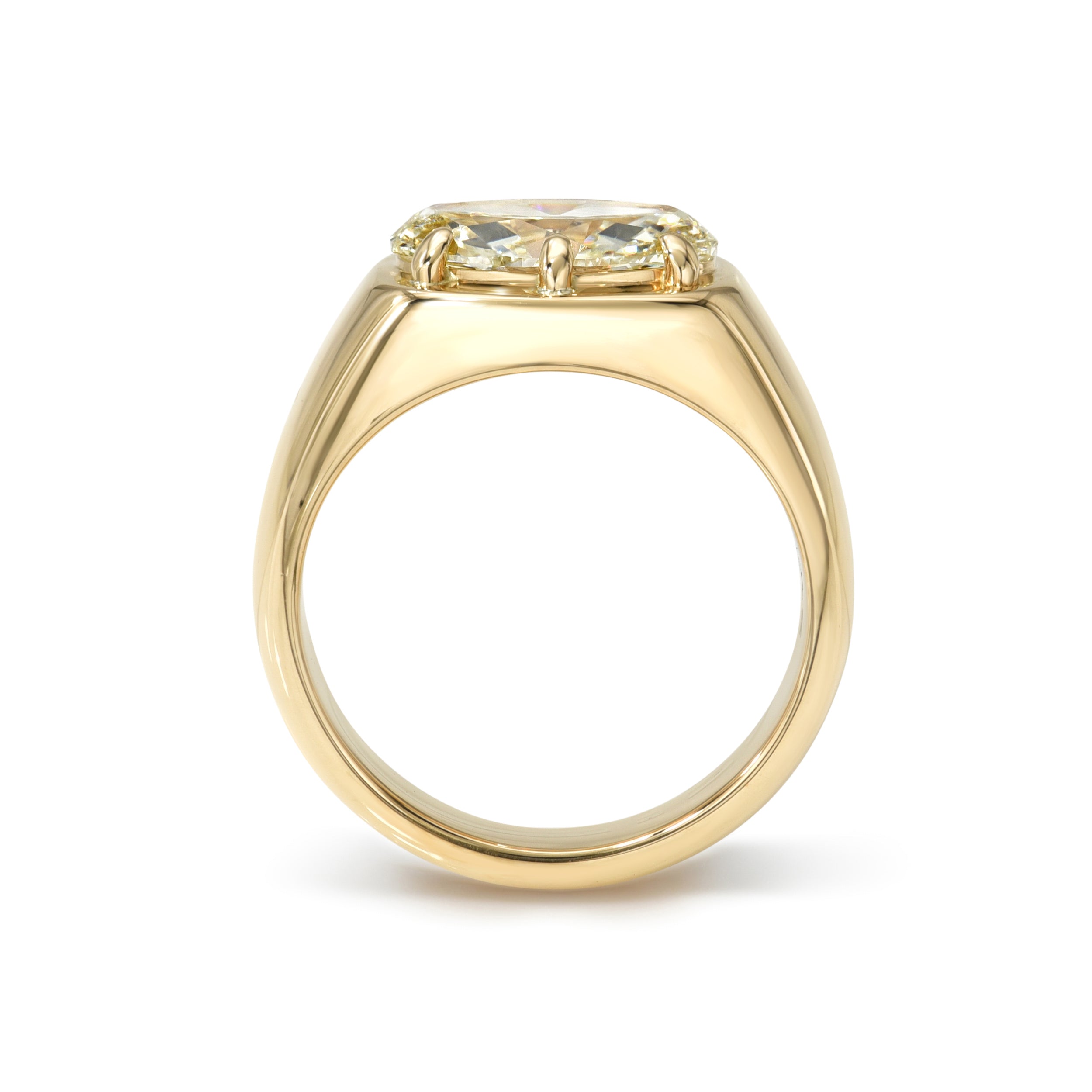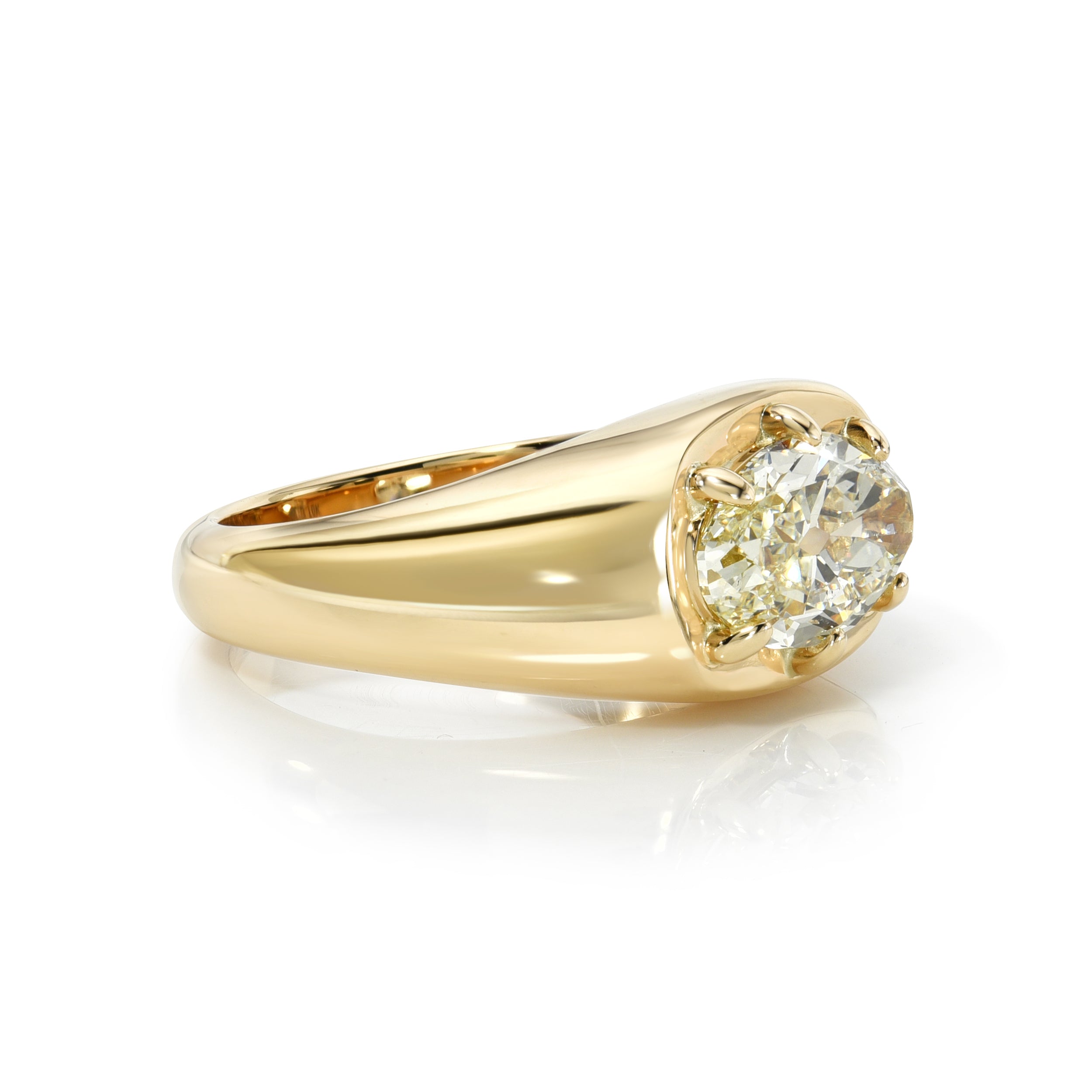 2.30ct M/VVS1 GIA certified moval cut diamond prong set in a handcrafted 18K yellow gold mounting.