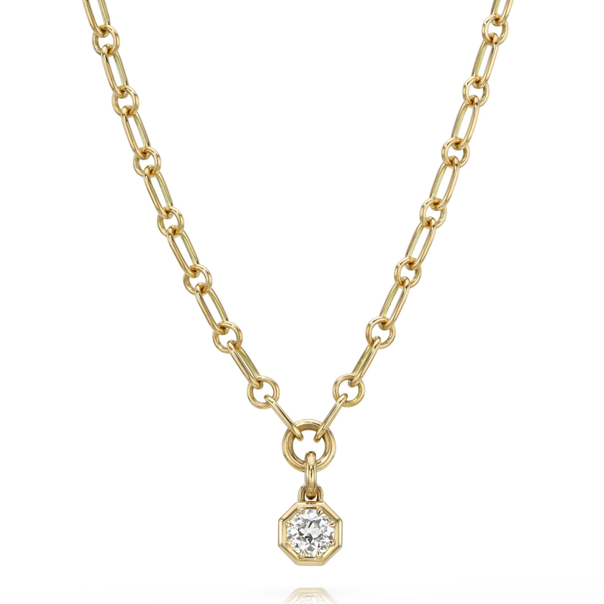 1.04ct J/SI1 GIA certified old European cut diamond prong set on our handcrafted 18K yellow gold Mini Lo chain.