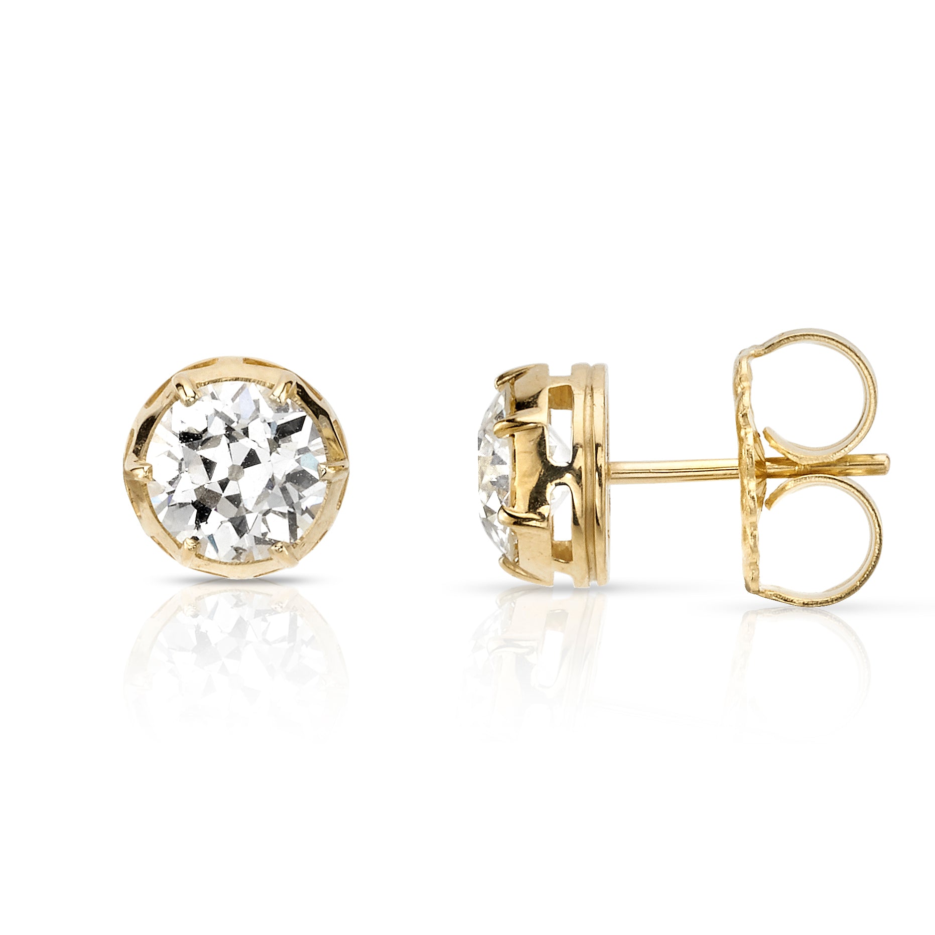 1.99ctw M-J/VSI-SI1 GIA certified old European cut diamonds prong set in handcrafted 18K yellow gold stud earrings.