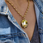 Model holding up an engravable vintage-style locket in yellow gold, with its chain around her neck, and smiling. Other Single Stone vintage-inspired necklaces are layered around her neck.