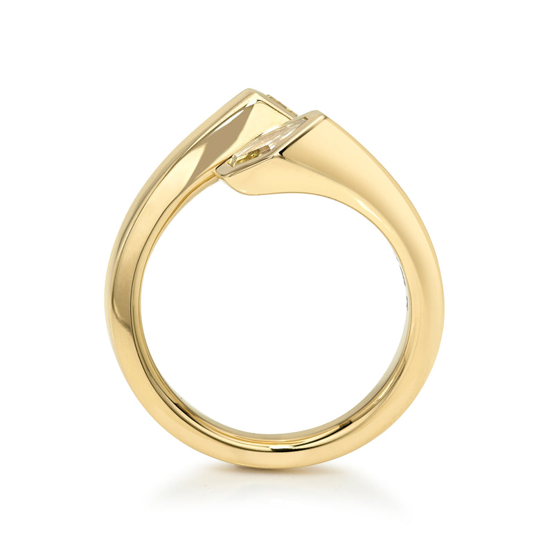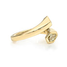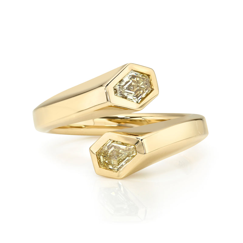 0.65ctw F-Y/VS1-VS2 shield cut diamonds set in a handcrafted 18K yellow gold geometric bypass mounting.
