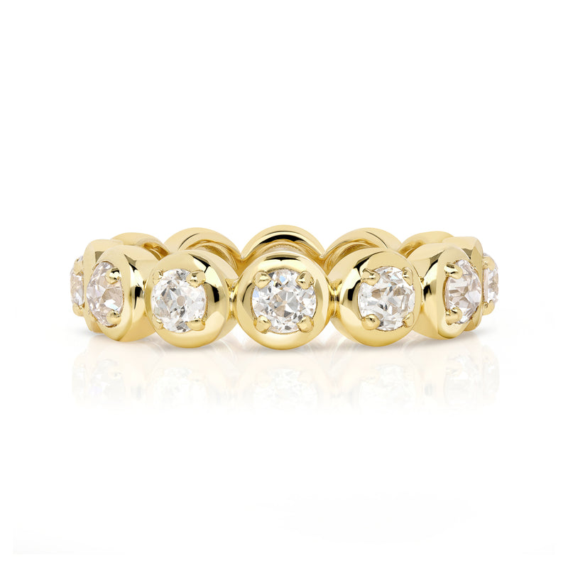 Approximately 1.60ctw G-H/VS-SI old European cut diamonds prong set in a handcrafted 18K yellow gold eternity band.
