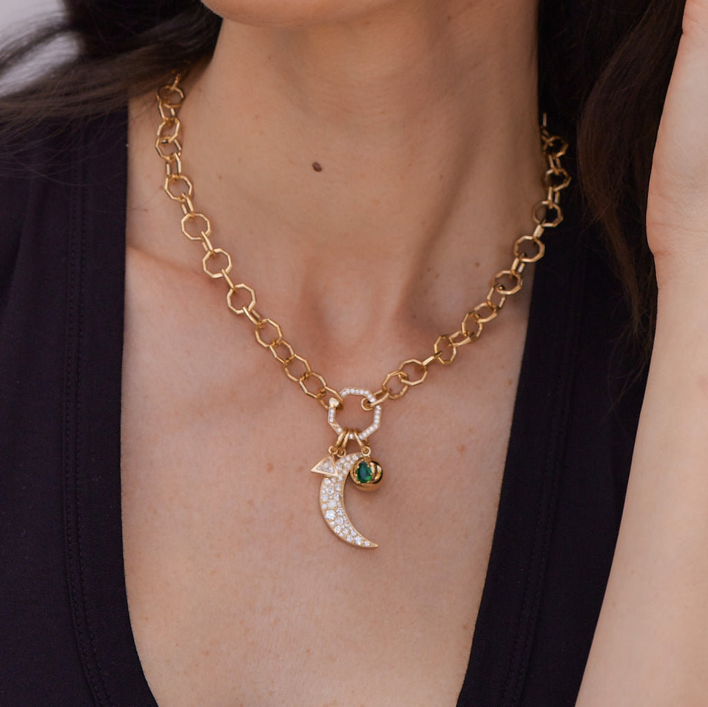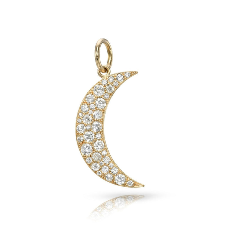 Approximately 1.60ctw varying old cut and round brilliant cut diamonds set in a handcrafted crescent moon-shaped pendant. Available in a polished or oxidized finish.