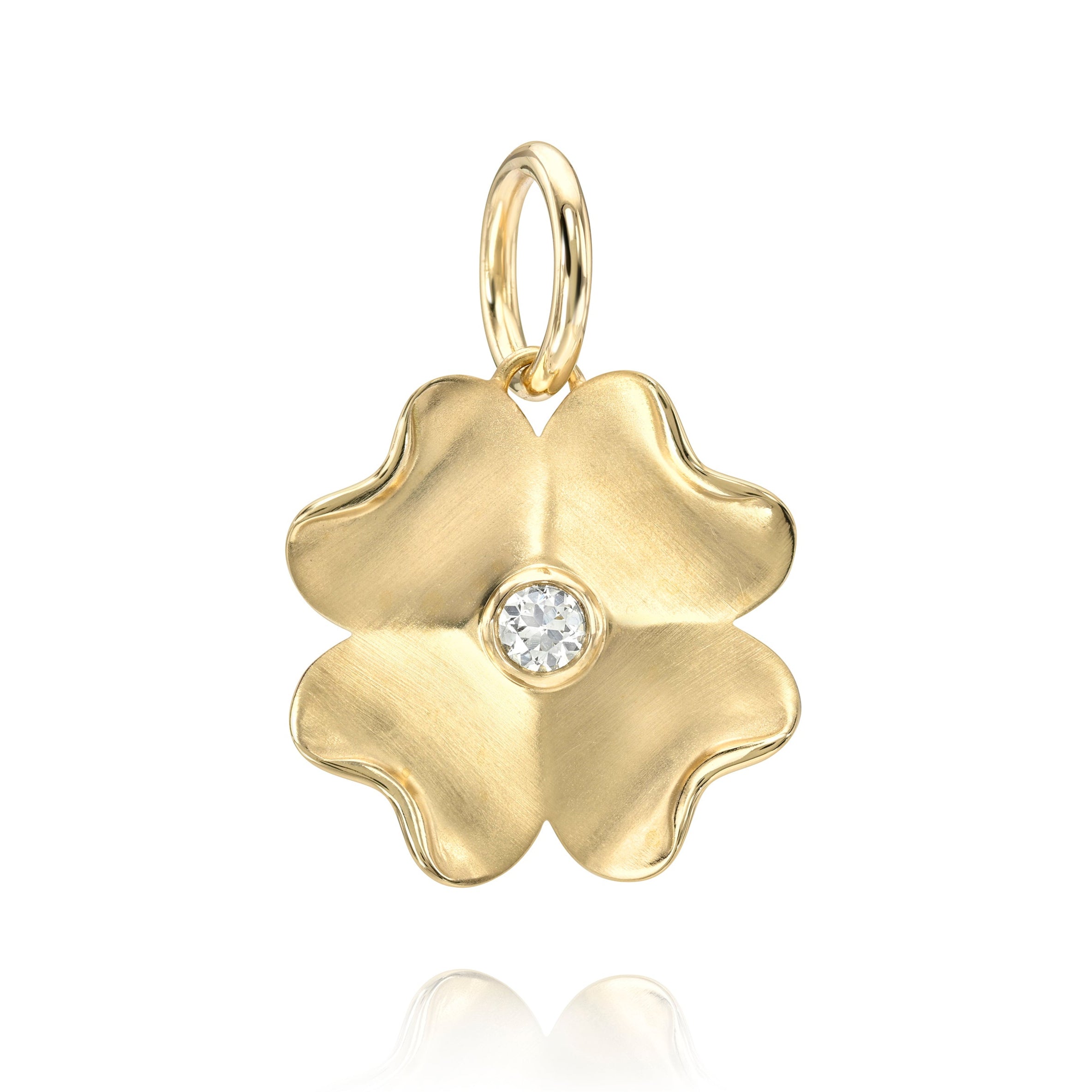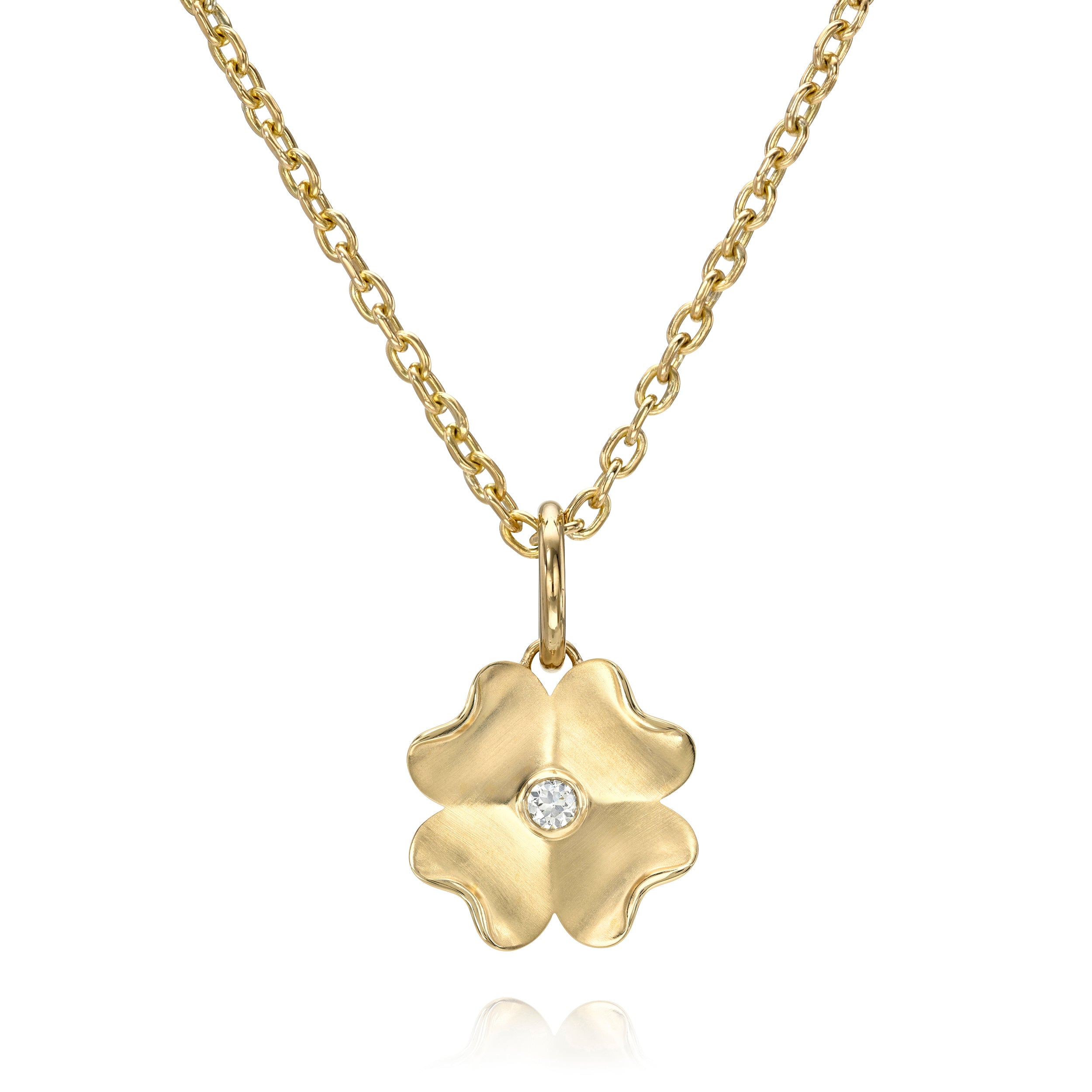 0.25ct H/VS old European cut diamond bezel set in a handcrafted, satin finish 18K yellow gold clover shaped pendant.