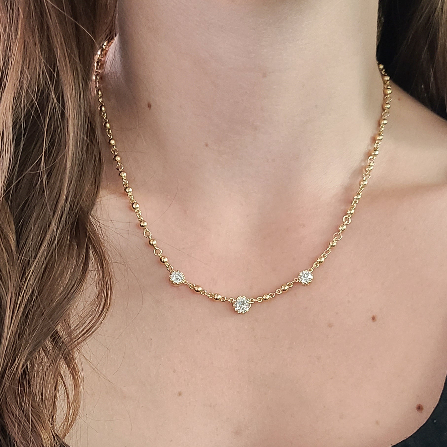 1.61ctw J-M/VS-SI2 old mine cut diamonds prong set on our handcrafted 18K yellow gold Rosary chain.