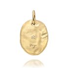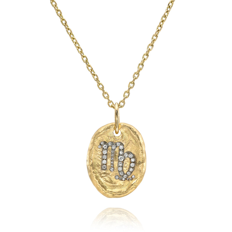 0.77ctw various old cut and round brilliant cut diamonds cobblestone set in a handcrafted, engraved hammer finished 18K yellow gold Virgo zodiac themed oval shape pendant. Shown on our Kai chain
